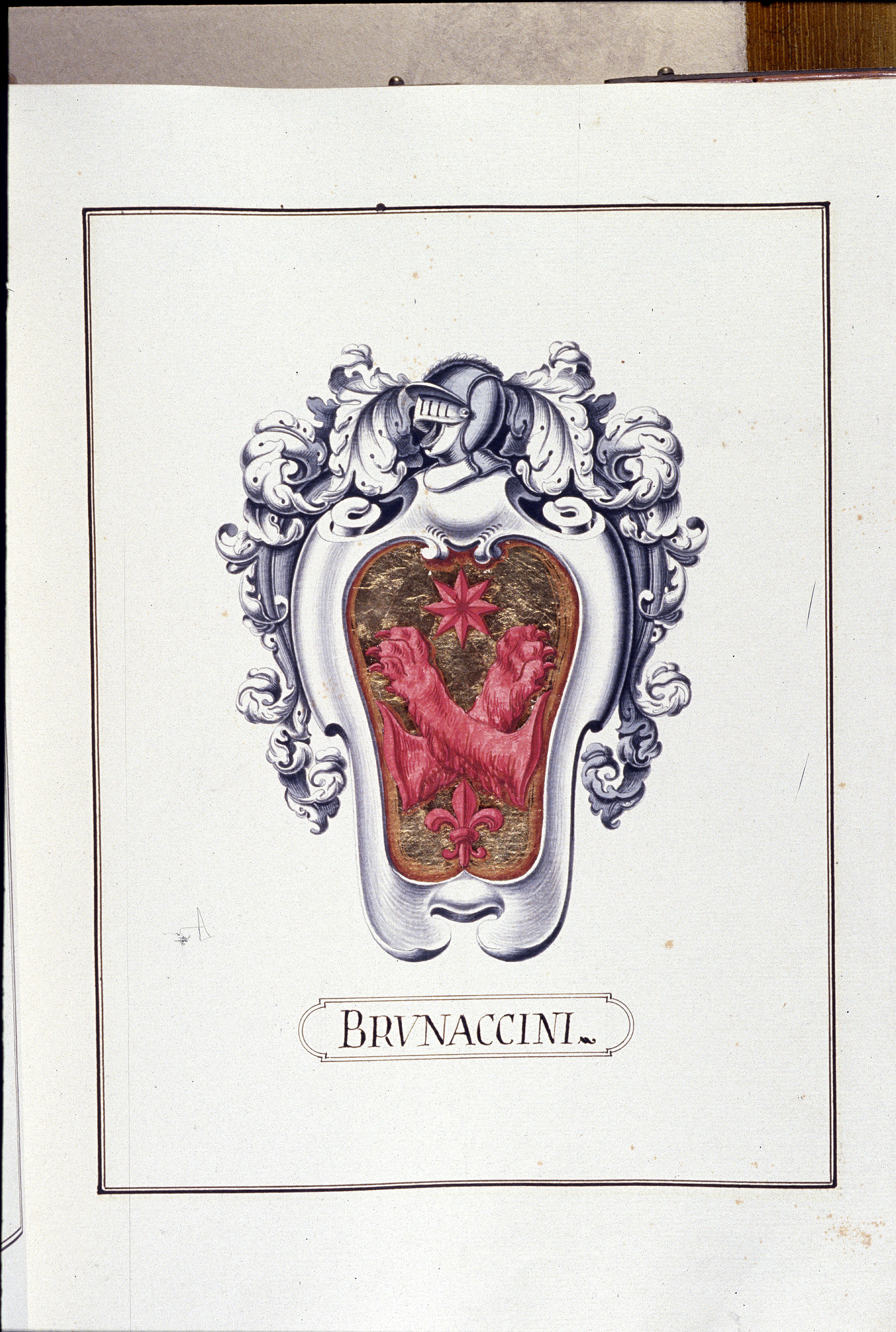 Si trova anche uno stemma d'argento, alla croce di sant'Andrea di nero, presentato come arma antica della famiglia, in occasione della richiesta di ammissione al patriziato fiorentino di Iacopo di Francesco Brunaccini, 1771.