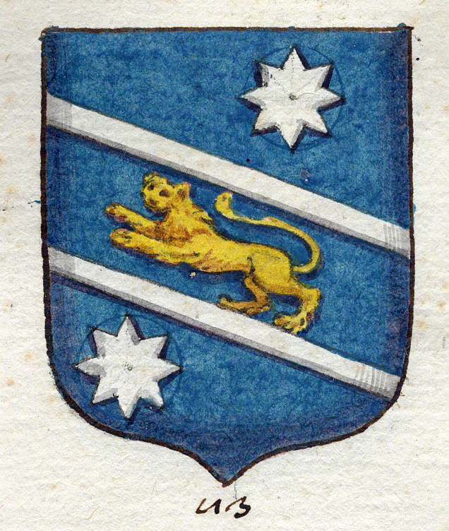 D'azzurro, alla gemella in banda (o in fascia) d'argento, racchiudente un leone leopardito d'oro e accompagnata da due stelle a otto punte dello stesso (o d'argento), una in capo e una in punta.