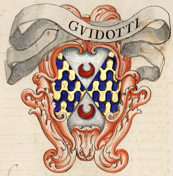 Il capo presente nel 2° tipo è una doppia concessione fatta ad Antonio di Andrea Guidotti, il quale fu mediatore della pace fra il re d'Inghilterra Edoardo VI e il re di Francia Enrico II (c.1550), per cui ottenne il grado di Pari d'Inghilterra e l'investitura a Cavaliere dello Speron d'oro da parte del re di Francia. Il 3° e 4° tipo, riportati dal Sepoltuario Rosselli nella Badia fiesolana, vanno sotto il nome della famiglia Rustichelli da Fiesole, della quale i Guidotti erano consorti.