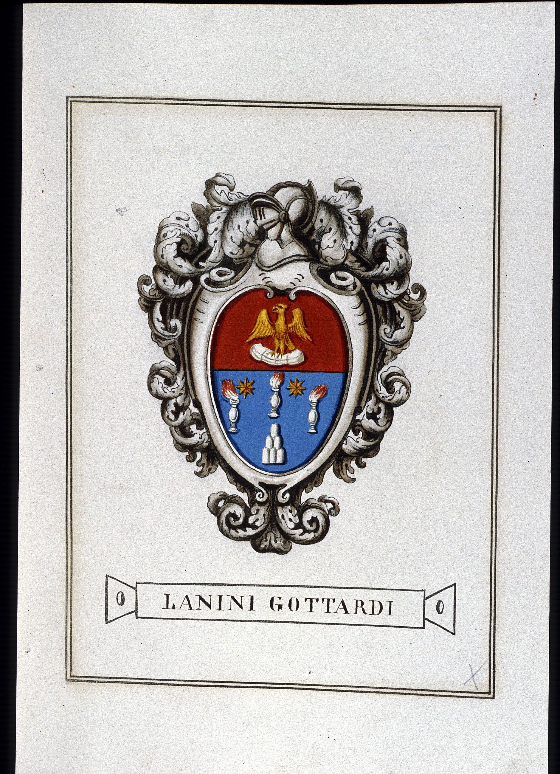Troncato: nel 1° di rosso, all'aquila dal volo abbassato d'oro, tenente fra gli artigli un torsello d'argento, legato di nero; nel 2° d'azzurro, a tre vasi d'argento infiammati di rosso, 1.2, accompagnati in capo da due stelle a otto punte d'oro e in punta da un monte di sei cime d'argento.