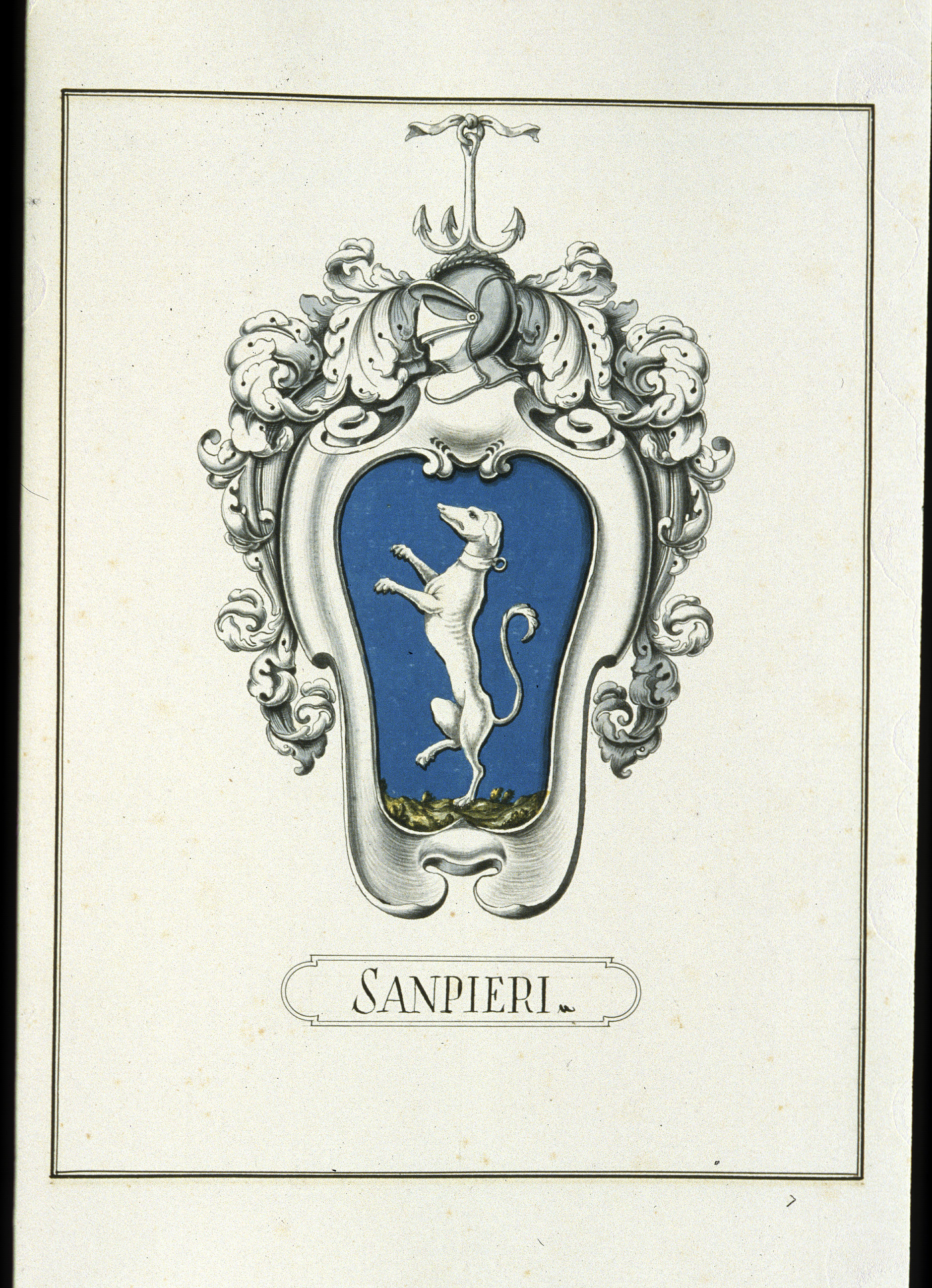 D'azzurro, al cane levriere rampante d'argento, collarinato dello stesso, sostenuto dal terreno al naturale.