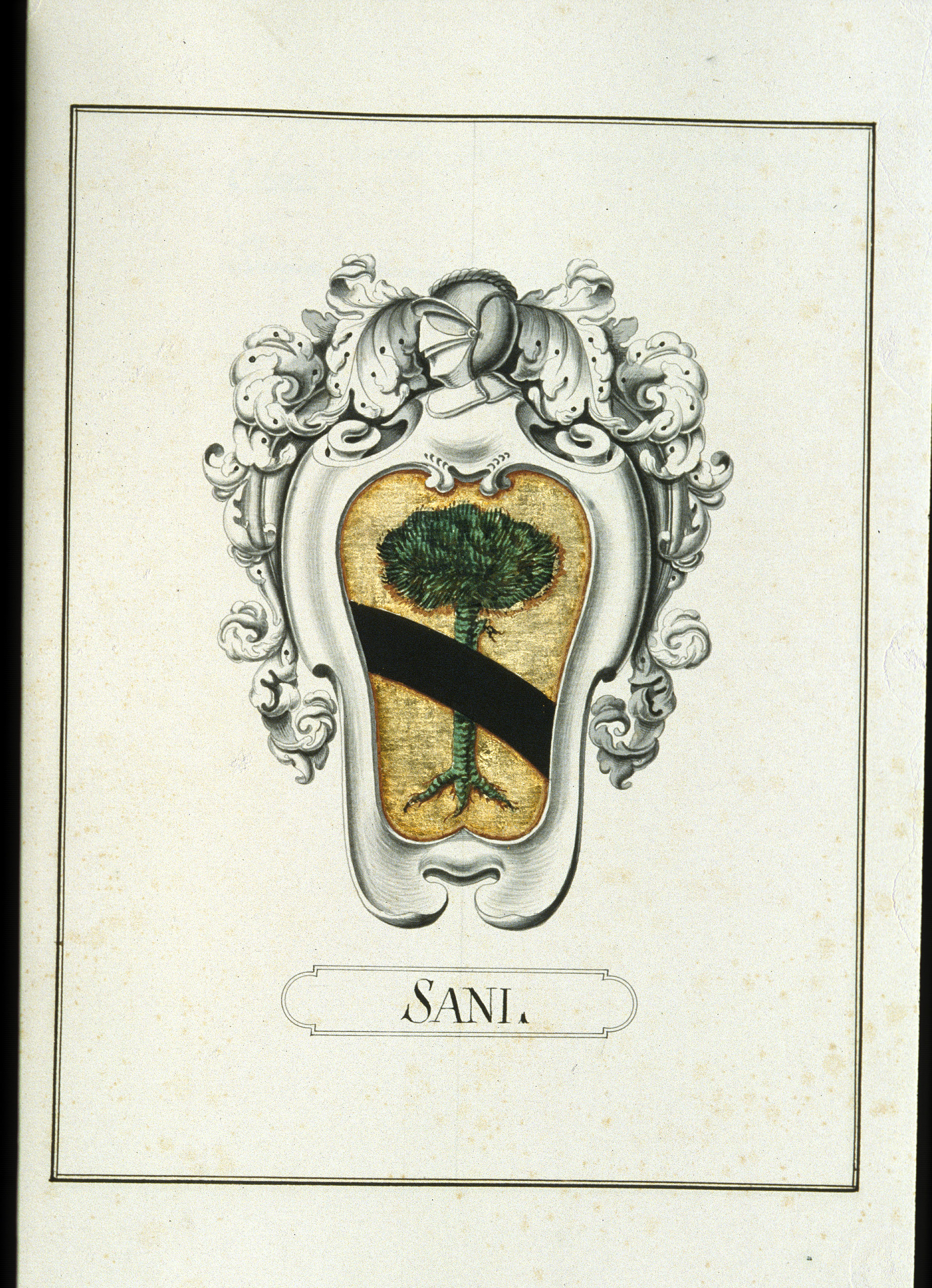 Si trova anche lo stemma della famiglia Sani Catignani Capannoli: semipartito troncato: nel 1° Sani; nel 2° Catignani (cfr. fasc. 5360); nel 3° Capannoli (di..., alla fascia di..., caricata di una rosa di...): per eredità a seguito dei matrimoni di Giovanni Antonio Sani con Virginia Capannoli e di Lorenzo Sani con Anfilizia Catignani nella prima metà del XVII secolo.