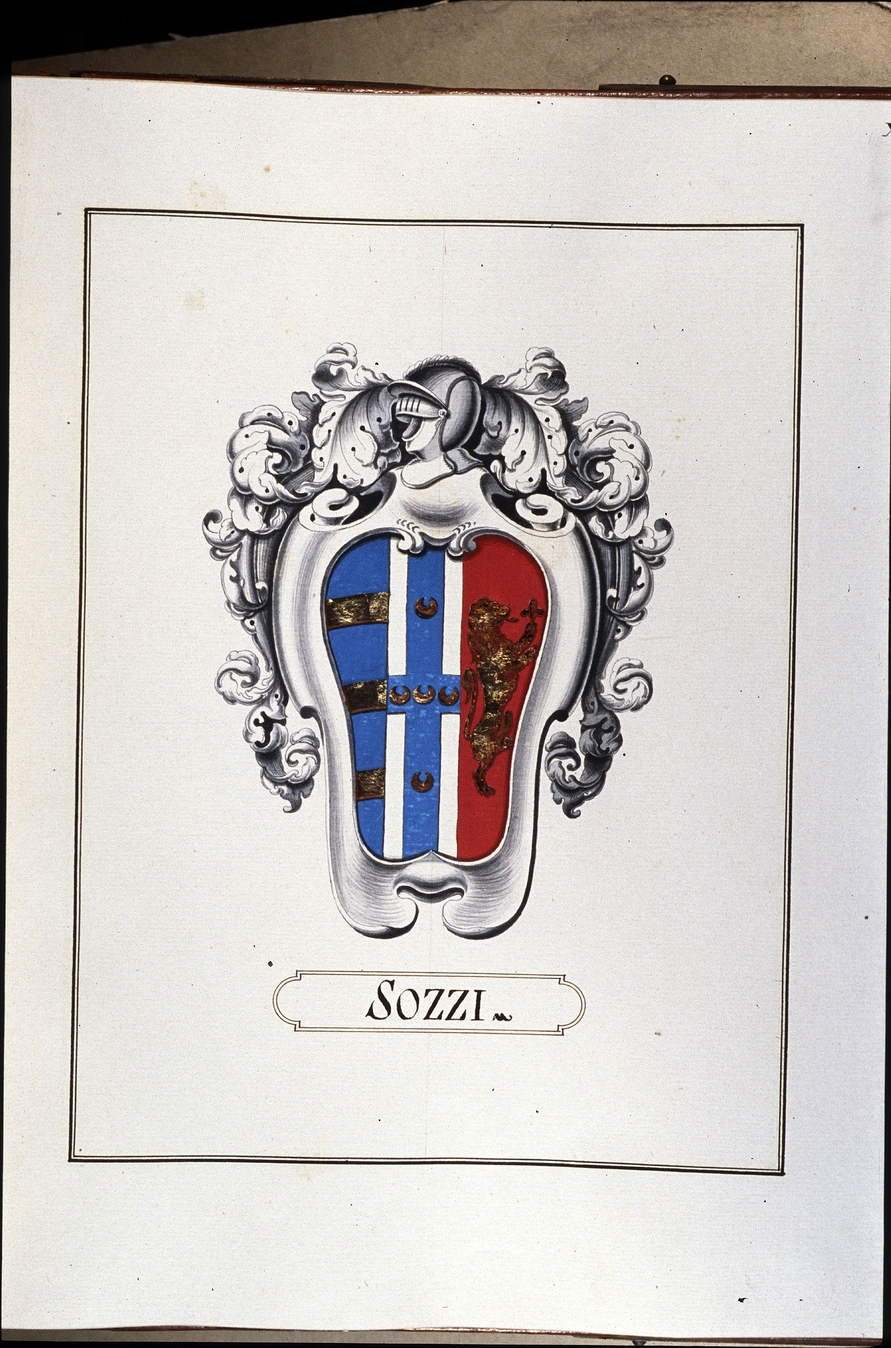Interzato in palo: nel 1° d'azzurro, a tre fasce d'oro; nel 2° d'argento, alla croce d'azzurro caricata di cinque crescenti montanti d'oro, 1.3.1; nel 3° di rosso, al leone rivolto d'oro tenente un giglio dello stesso.