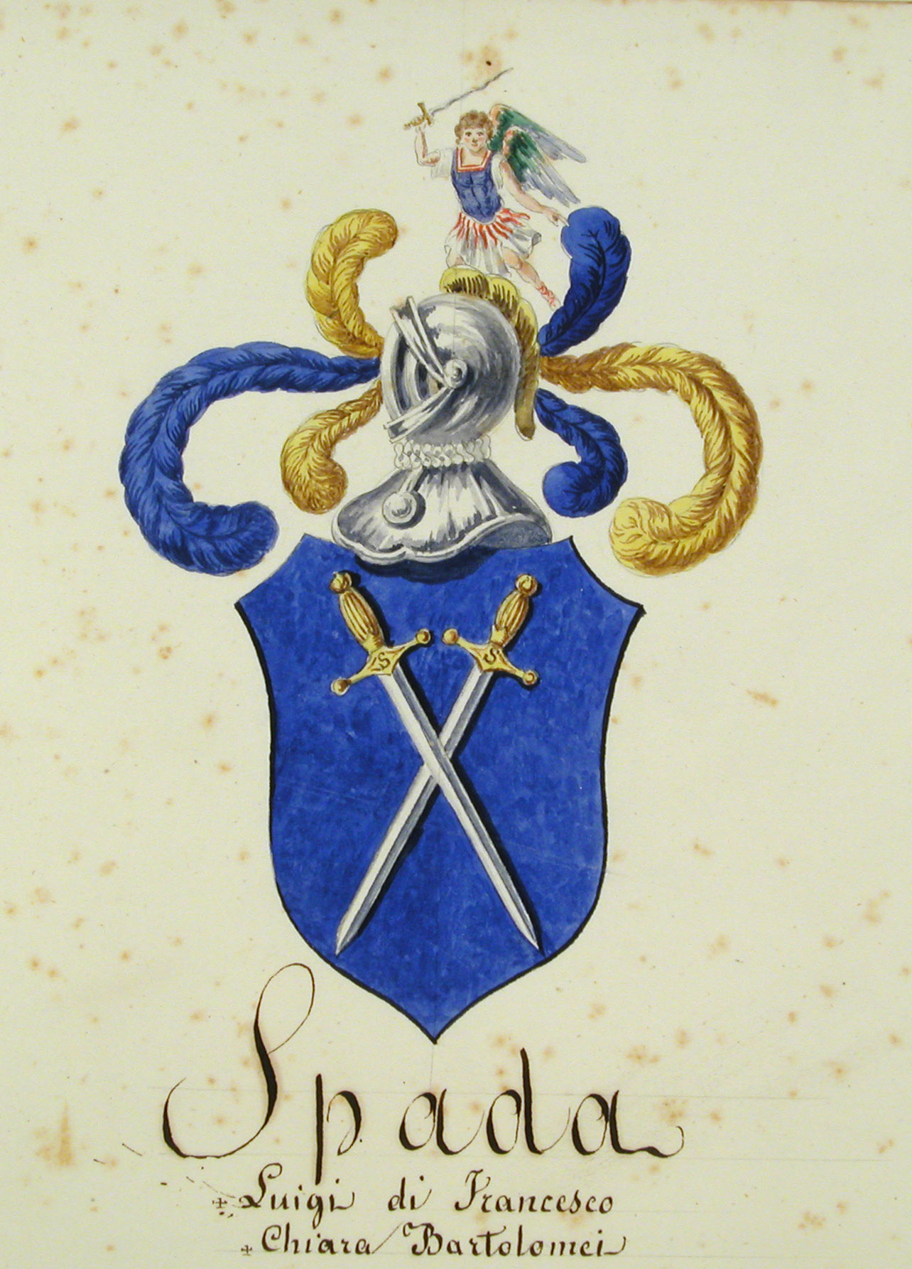 Si trova anche partito con lo stemma della famiglia Cenami (cfr. fasc. 5379), a seguito del matrimonio di Francesca Spada con Adolfo Cenami (I metà secolo XIX). Il Crollalanza riporta anche un altro stemma: «di rosso, a tre spade nude d'argento, guernite d'oro, poste in banda, una sopra l'altra; col capo d'azzurro, caricato di tre gigli d'oro».