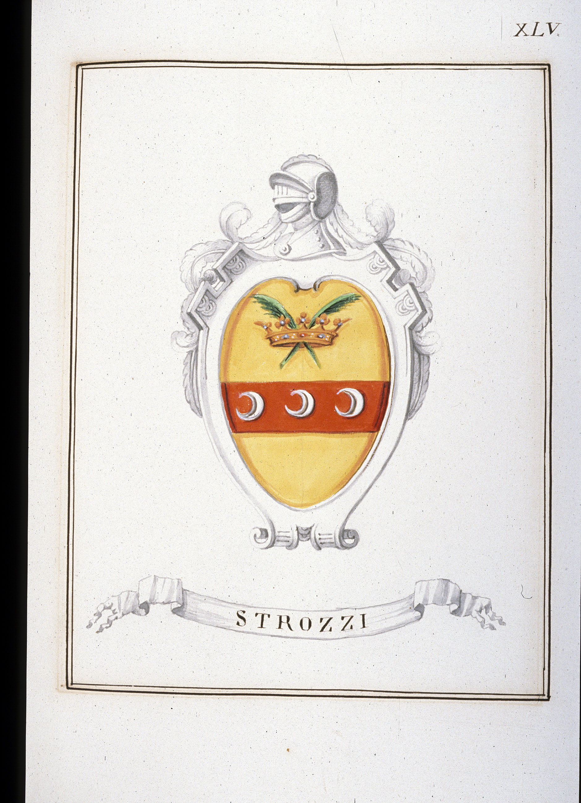 I crescenti si trovano anche volti o rivolti nel senso della pezza. Lo stemma si trova anche partito con quello della famiglia Vespucci (Antonio Strozzi e Antonia Vespucci, 1523), con quello della famiglia Manfredi (Giovanni Strozzi e Lisa Manfredi, ?) e con quello della famiglia Buini. Lo stemma del 3° tipo appartiene a fra' Alessio Strozzi, sepolto in S.Maria Novella nel 1383. La corona palmata fu concessione del re di Napoli a Palla Strozzi nel 1415. Ferdinando Strozzi ottenne nel 1846 l'ammissione alla nobiltà di San Miniato