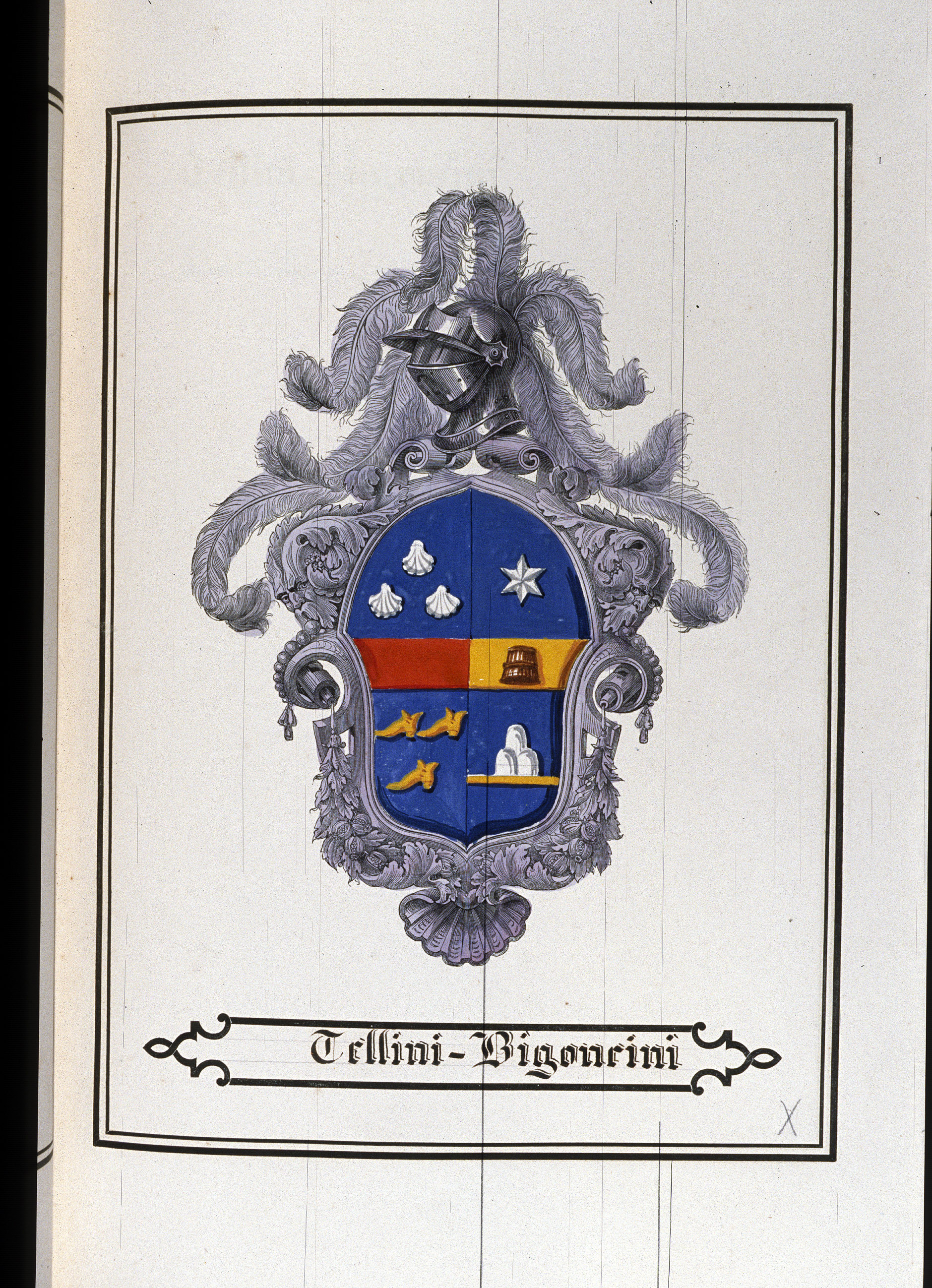 Partito: nel 1° d'azzurro, alla fascia di rosso accompagnata in capo da tre conchiglie d'argento, 1.2, e in punta da tre calzari d'oro, 2.1; nel 2° pure d'azzurro, alla fascia d'oro caricata di una bigoncia al naturale e accompagnata in capo da una stella a sei punte d'argento, e in punta da un monte di tre cime dello stesso sostenuto da una divisa d'oro.