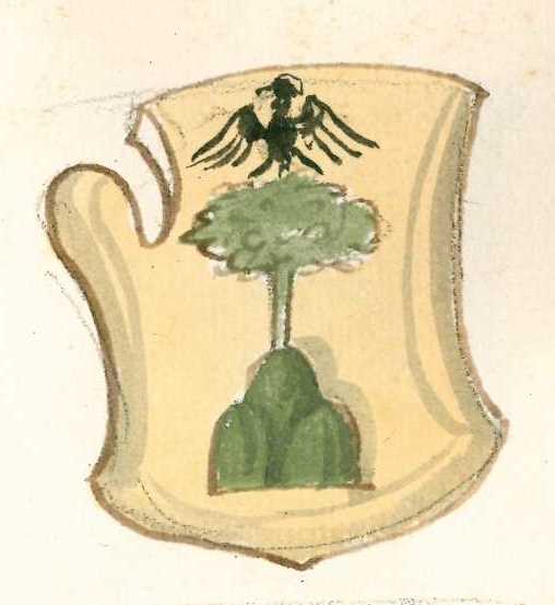 D'oro, all'albero di verde nodrito su un monte di tre cime dello stesso, e sostenente sulla chioma un'aquila dal volo abbassato di nero.