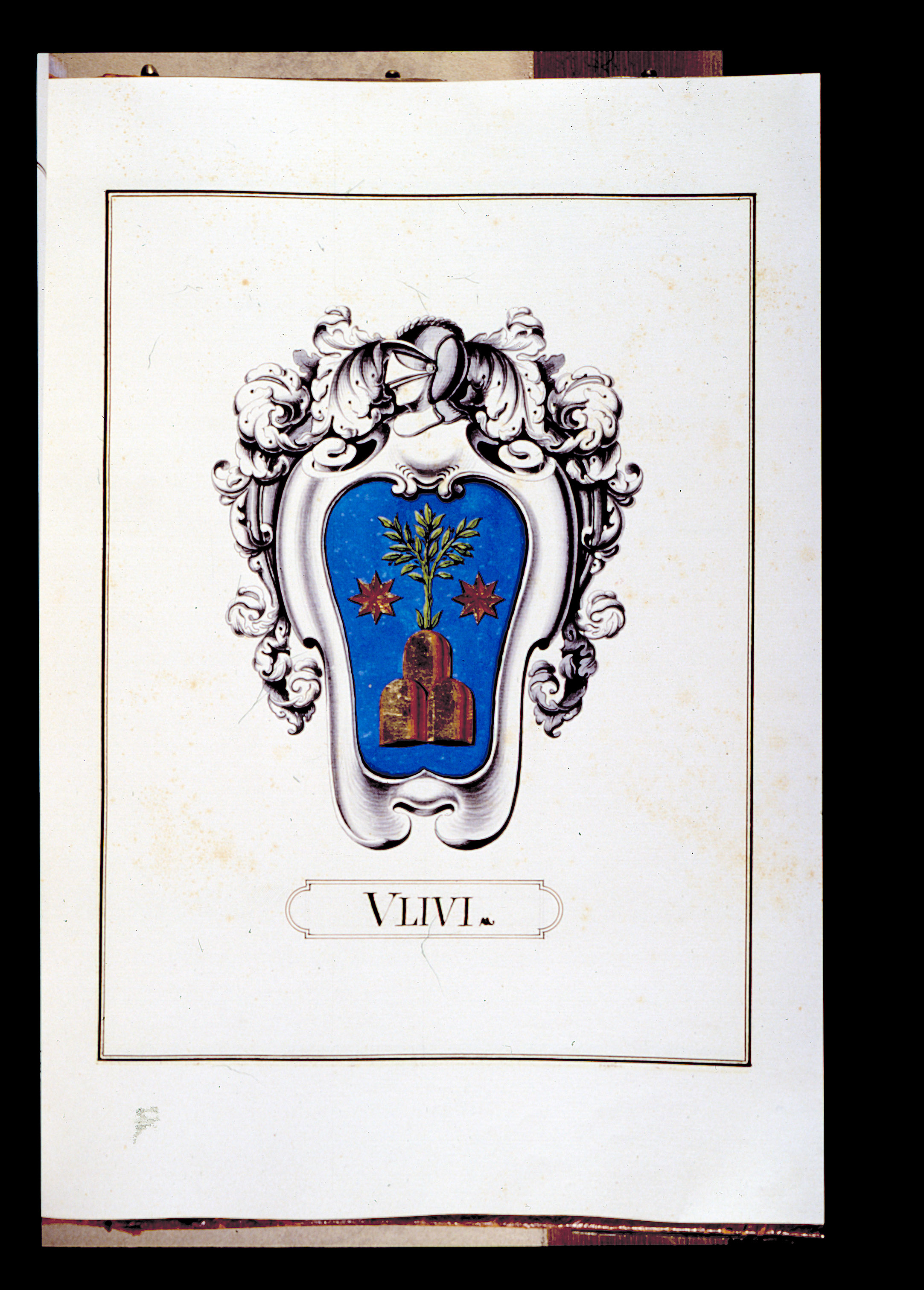 D'azzurro, all'albero (o ramo) di olivo di verde nodrito su un monte di tre cime d'oro, e accostato da due stelle a otto punte dello stesso.