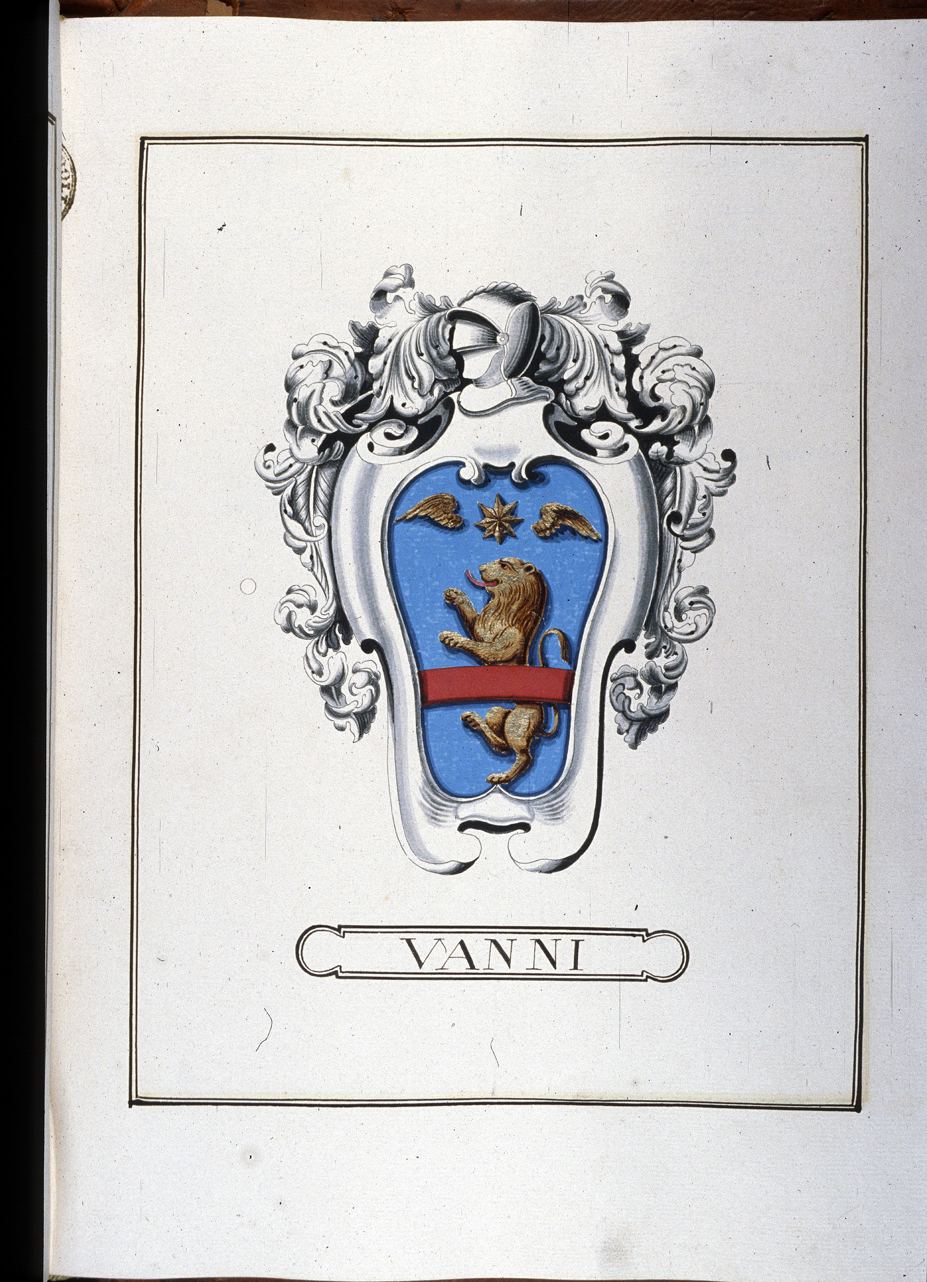 D'azzurro, al leone d'oro attraversato dalla fascia di rosso e accompagnato in capo da una stella a otto punte d'oro, posta in mezzo a due semivoli addossati dello stesso.