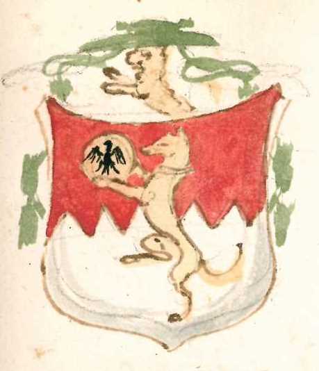 Troncato cuneato di rosso e d'argento, al cane rampante attraversante d'oro, tenente con le zampe anteriori uno scudetto rotondo dell'Impero.